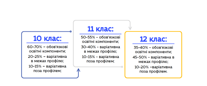 3. Зміст освіти в ліцеї має бути гнучким та варіативним і складатися з трьох компонентів: обов’язкових для всіх освітніх компонентів; варіативної частини в межах обраного профілю; варіативної — поза профілем. З 10 до 12 класу кількість годин на вивчення обов’язкових для всіх освітніх компонентів зменшуватиметься, натомість кількість годин для вивчення варіативної частини — збільшуватиметься: